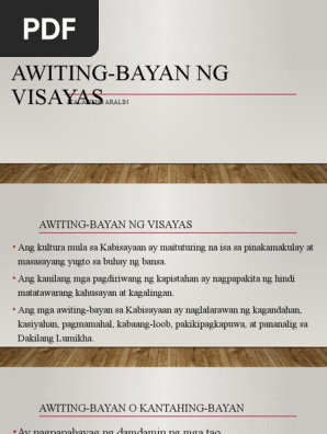 18 18 found this document not useful Mark this document as not useful. Awiting Bayan sa Visayas. Ang awiting-bayan ay nagsimula bilang mga tulang may sukat at tugma subalit kailanmany nilapatan ng himig upang maihayag nang pakanta.